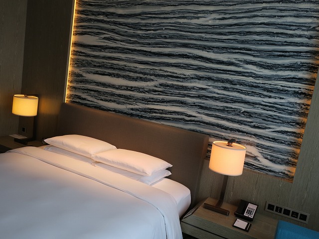 ベッドルームは雰囲気が一つ落ち着いた感じになります。フカフカなベッドですが腰があり、ゆっくり寝れました。ベッドのヘッドボードの壁のデザインは流石ですね!