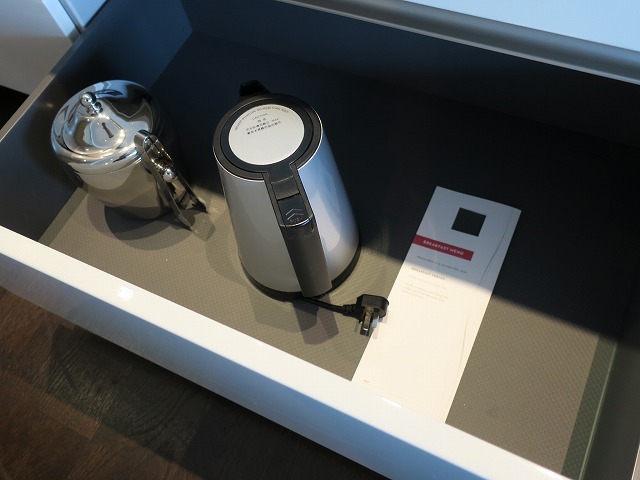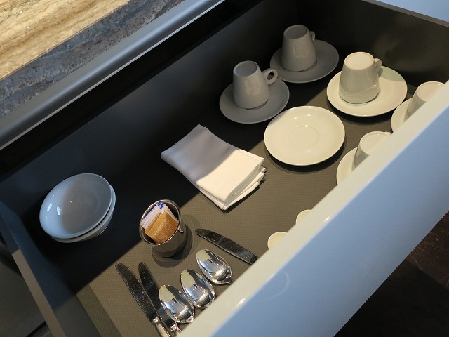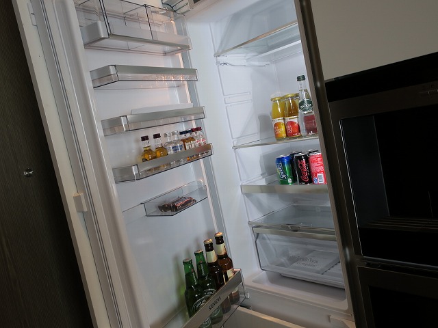 もちろんシンクや調理器具も抜かりはありません。包丁から電子レンジそして大型の冷蔵庫まで今風に揃っています。冷蔵庫の飲み物はそれなにり充実しています。でも・・ここは自分で買ってくる雰囲気ですね。ここまで来たらバトラーサービスがあるのか聞きましたが、今は無いとの返事です・・・残念!
