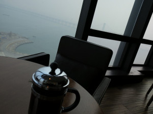 到着した日は生憎の曇りでしたが翌日の朝は晴れ渡り素晴らしい景観を楽しめました。海の向こうには大連の渋滞を緩和するためにできた海上道路が見えます。