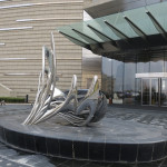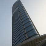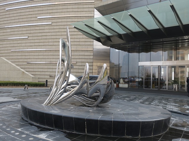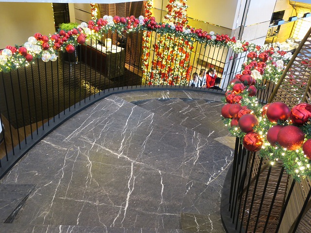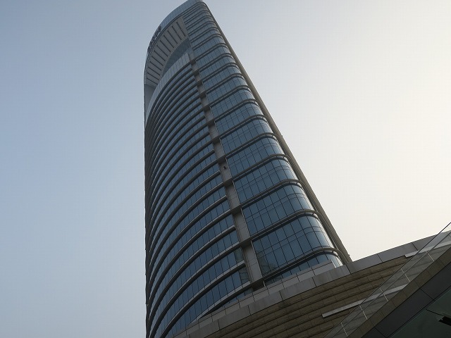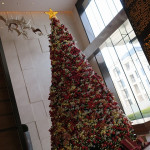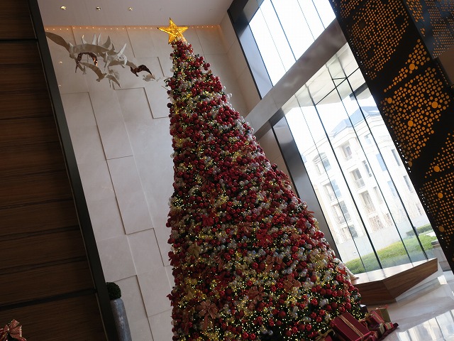40分程度でホテルに到着します。遠くから見ると例の建物です。10年前から予定されていた場所に見事に建物ができています。ロビー内にはクリスマス前の滞在だったのでクリスマスツリーが目立ちます。