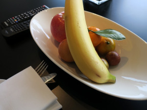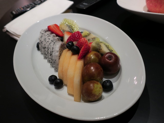 ウエルカムで頂いたワインとフルーツだけでは不足なのでフルーツプレートをインルームで頼みますが、これは容量も多く美味しく頂けました。深夜であっても15分ぐらいで準備されたのは流石です。