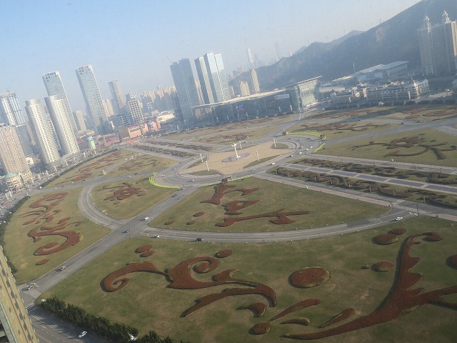 エレベータの中でホテルの経緯なども聞きますがあまり知らないとの事でした・・まあそんな事もありますよね。廊下の途中では世界最大級と大連の人が言う星海広場がスッキリと見えます。こうやって上から見るとまた綺麗ですね!