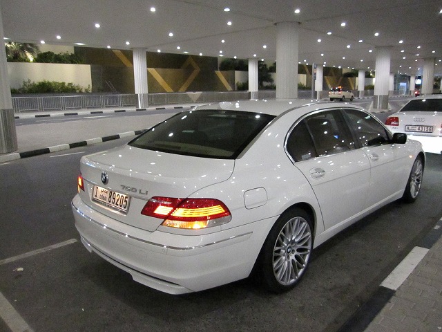 空港までホテルの車に迎えに来てもらいました。到着したらエミレーツのシュータサービスとは逆の普通の出口に向かいます。出口の前に多くのホテルのカウンターがあるのでHYATTを見つけて入ります。名前を言うだけでスムースに対応してくれました。ポーターがカウンターまで迎えに来て、車付きまで案内です。車はBMW7シリーズです。やっぱりこうでなくっちゃ!