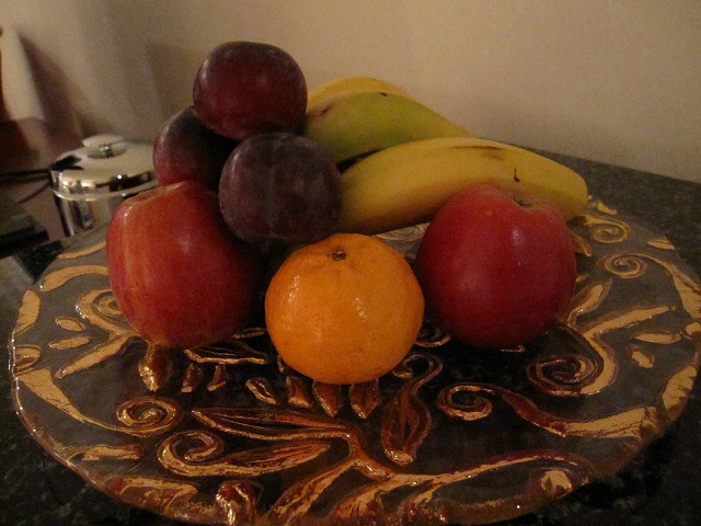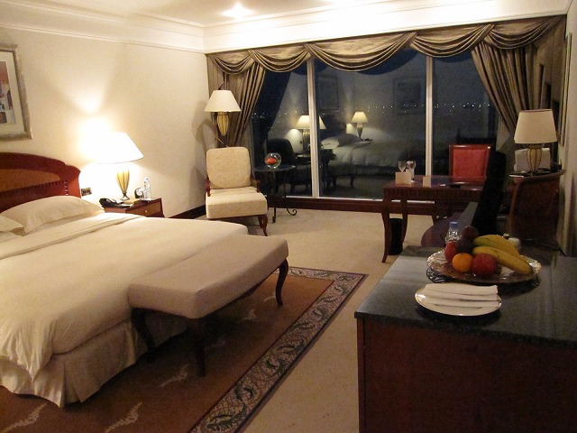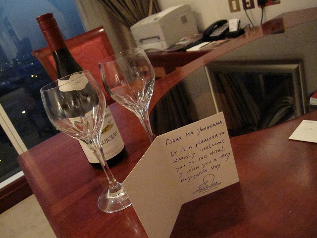部屋に入るとダイヤモンド会員のWelcomeキットとして赤ワインがあります。私はアルコールは飲めませんが、イスラム圏でも置いてあるんですね。そしてフルーツは毎日追加されます。これは良いサービスです。本当に追加してくれるところは少ないのですが、私は果物大好きですから嬉しいサービスです。
