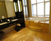 シンクはダブルで最近流行りの四角形です。しかし・・蛇口の位置まで横に来ているのは珍しいですね!これは目の前の鏡は開けてベッドルームと接続することが可能だという事でしょう。アメニティもpeter thomas rothが準備されています。残念ながら歯ブラシはリクエストが必要です。私は自前であるので問題ありません。