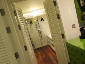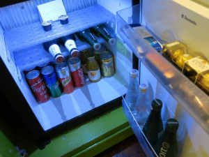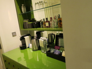 真っ白な扉になっています。入って直ぐにミニバーがありますが緑色のこじゃれたデザインになっています。ここにこの色で持ってくるセンスは良いですね。エスプレッソマシーン、水、ケトル、ハードリカーそしてシェイカーと総て揃っていました。冷蔵庫の中身も充実しています。今回はプールサイドでコーラーを氷で楽しみました。