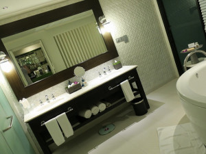 大きなダブルのシンクと鏡が目に入ります。準備されているバスタオルの数も十分すぎました。アメニティはHARNNで揃えられています。このメーカを準備しているホテルは少ないので存分に楽しませていただきました。