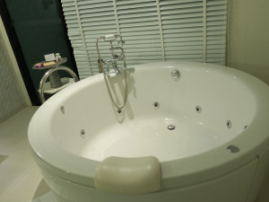 バスタブはジャグジーの丸形です。頭を置く場所もあるので気が利いています。近くにはバスソルトなどが花と共に置かれています。しかし・・・お湯を貯める時間がなく今回はシャワーのみとしました。