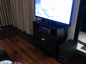 窓はウオークインになっており外に出ることができます。窓の中心にはテレビがあり、BOSEの音響システムがきれいに入っています。