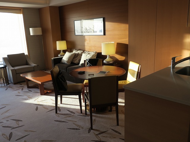部屋の名前はレジデンスと言われていますが構成は一般的なスイートです。リビング兼キッチンにベッドルームそしてバスルームです。お手洗いは一つですが、リビング側とバスルームからのアクセスの両方ができるようになっているので意味合いとしては十分です。洗濯機やキッチンがあり長期滞在も可能にしてあるのがポイントのようでした。