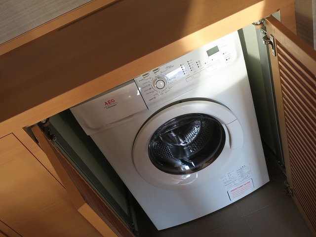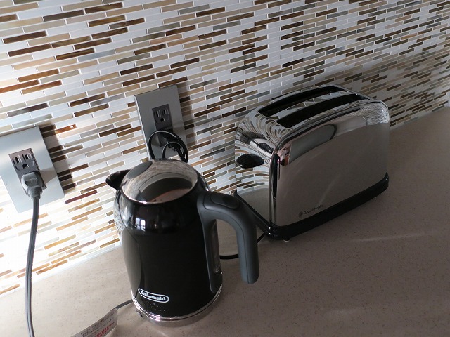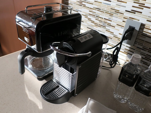 部屋の手前部分にはオープンキッチンが準備されています。ミニバーでは無くキッチンと呼んで問題ありません。これがレジデンスとこの部屋を銘打っている理由なのではないかと思います。キッチンなので食器、電子レンジ、洗濯機、食器洗浄、ケルトにトースターまで準備されています。今回は使いませんでしたが子供を連れて長期滞在するには良いでしょうね。