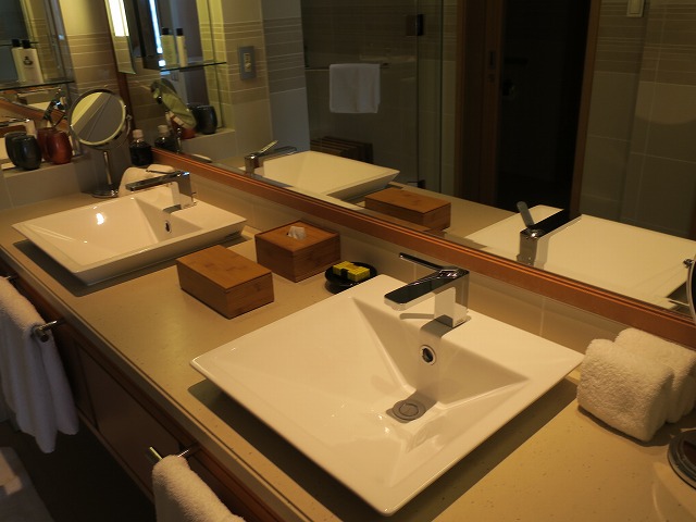 ダブルのシンクの洗面がダウンライトの中で良い雰囲気です。洗面台にたまった水を抜くときに蛇口の後ろにあるバーで行いますが此れは何時も分かりにくいと思います。