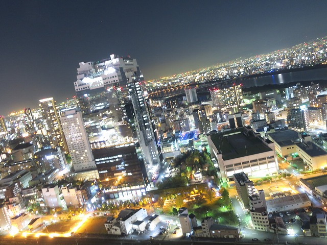 部屋の中を見ると広々とした部屋の中に大阪の街が見えます。太陽の光を一杯に受けて気持ちの良い景色をたのしめました。夜になると今度は素晴らしい夜景が広がりました。下の広場は駅と花の公園が作られるそうです。色々とスタッフの人に話を聞きましたがなるほどです。個人的には新しいホテルができると嬉しいのですが・・・(笑)