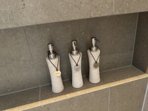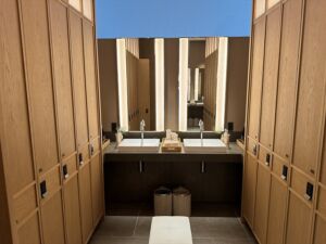 チェンジングアリアはスパと共有ですが家族用の男女共用のエリアもありました。宿泊者は部屋からバスローブで3階まで移動しても良いので楽な法を選択できます。ただし部屋にバッグは無いので自前で荷物を入れるバッグを準備する必要があります。たぶん近い将来には改善されると思います。