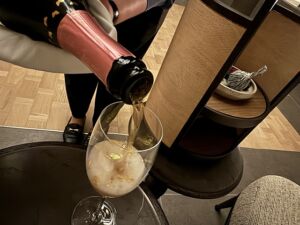 終了後にリラクゼーションとして少し暖炉の前でお茶を頂きますが、開業という事で金粉入りの特別なシャンパンを頂きます。そして私がアルコールを飲めないことは今回の滞在では一言も言っていませんがちゃんと理解されておりアルコールフリーで準備されています。一事が万事私の事を理解した対応が進んで驚くしかありません。当然開業なので裏では大騒ぎで大変だと思いますが、私が見える範囲では少しの混乱程度であり100点満点中100点の開業です。