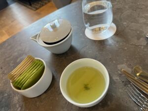 席に座ってウェルカムドリンクとして濃厚な抹茶を頂きます。この味からお茶に拘りがあると感じたので合わせる飲み物は玉露をお願いします。話を聞くと三煎まで飲めるとの事です。パウダーではなく古来のやり方で煎じている事が分かります。ホテルのロビーラウンジで本当に煎じているのは珍しいので拘りに嬉しくなります。