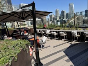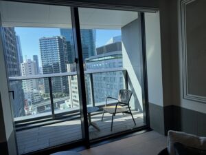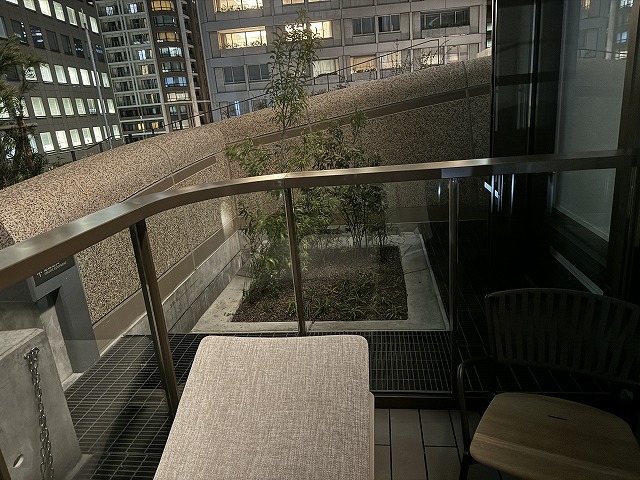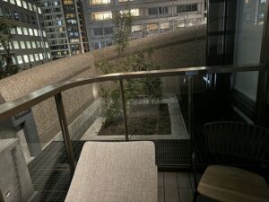 外のテラスには机と椅子があります。完全に禁煙の場所なのでタバコを吸うわけではありませんが外の空気を楽しむことができます。飛んでいかないようにワイヤーがあるのは成程と思いました。下を見るとウェルネスの設備の一部が見えるので夜に期待です!