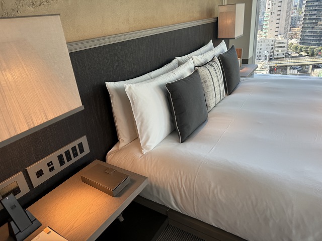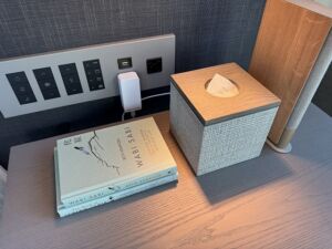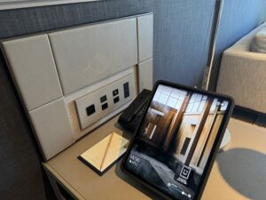 リビングは会議に出たりする必要があった時にも便利に使えます。書斎机は広くて機能的なのでゆったりと仕事をする事ができました。壁にはUSBアウトレットがあります。TYPE-Cが準備されているのも新しいホテルらしいですね。それ以外にも日本式およびユニバーサルの電源アウトレットもあり良く考えられています。WiFiも十分なスピードと安定感で接続出来たのでオンライン会議もストレスなく出席できました。