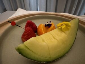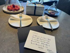 部屋の真ん中には丸机が3つとソファーと椅子となっておりインルームダイニングはこちらで頂きます。ウエルカムフルーツとして苺やスイーツが準備されています。今回のメインは子供たちなので手を付けずに私は我慢我慢・・総支配人の方からメッセージも頂きました。支配人ならではの期待と不安を感じながらの開業だったと思いますが素晴らしい開業でしたね。ソファーの向かいには隠されていますがテレビも配置されています。未だにアマンの考えでテレビがあると違和感を感じるのは私だけでしょうか(笑)