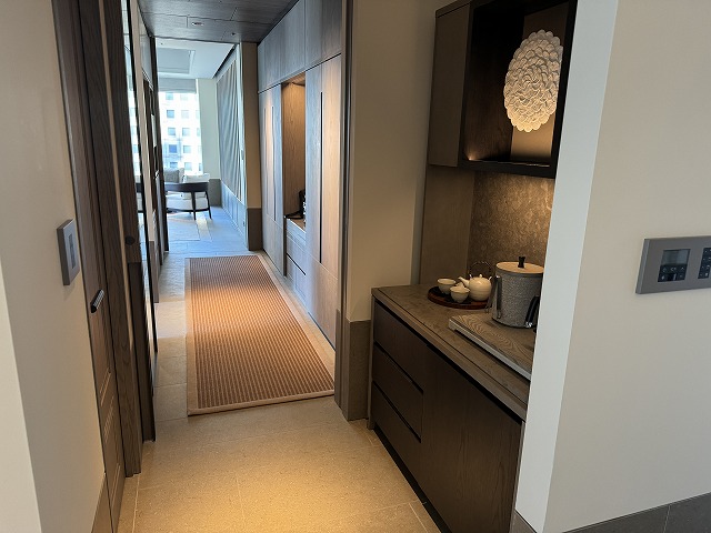 リビングからベッドルームの間にウエットエリアはあります。接続する通路をうまく使ってミニバーとクローゼットが配置されています。境目には扉があるので此処の扉を閉めるとウエットエリア・ベッドルームはプライバシーが守らるようになっています。
