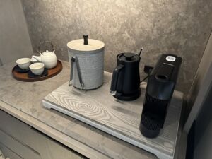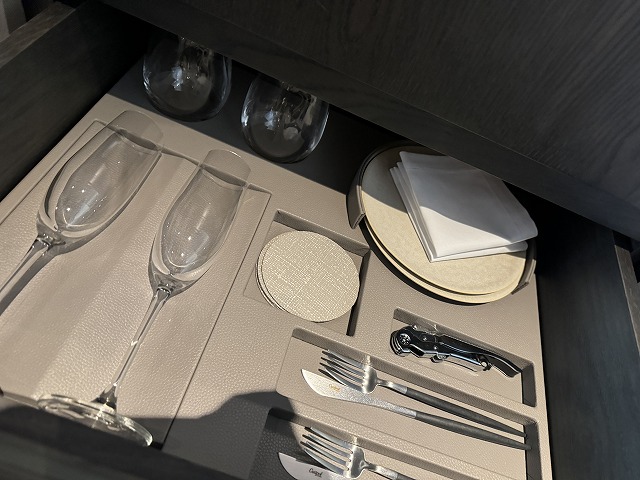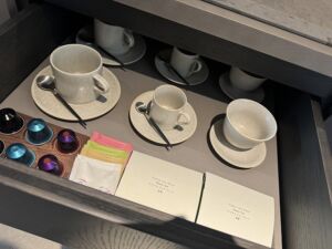 ネスプレッソ、ケトル、アイスそして急須は問題なく使えます。引き出しを開けるとカップやグラスも準備されています。殆ど問題ありませんが、私的には炭酸水が欲しかったですね・・