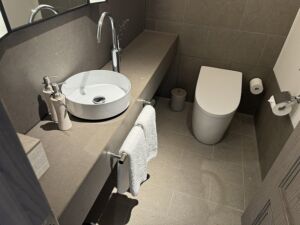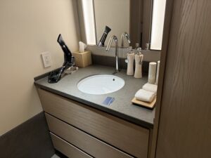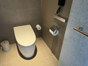 一つ目のトイレはミニバーの向かいにあります。当然ウオッシュレットの最新型なので文句のつけようがありません。シンクも個別に準備されて広さも十分なのでこれ一つで十分なくらいです。