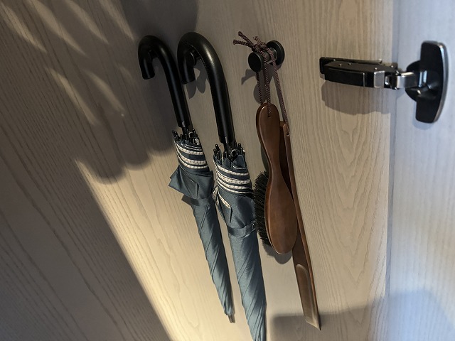 クローゼットの中にはハンガー、傘、ブラシ、靴ベラがあります。女性が忘れてはいけないのがドライヤーです。何故かクローゼットの中にありますので良く探してみてください。