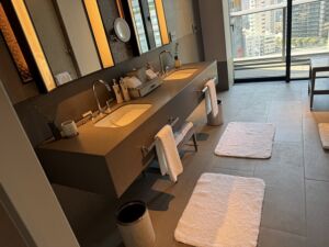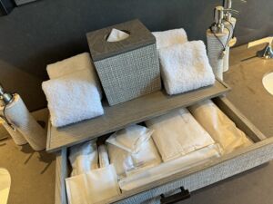 シンクはダブルの落ち着いた作りです。二名で滞在するのにぴったりの数がバスローブ、バスタオル、歯ブラシなどは準備されていたので後から子供の分をお願いする事にしました。その他にはブラシやシャワーキャップ等必要な物は総て揃っています。分かりにくかったのは歯磨き粉です。チューブではなく別のパッキングだったので最初は歯磨き粉が無いパターンかと思いました。