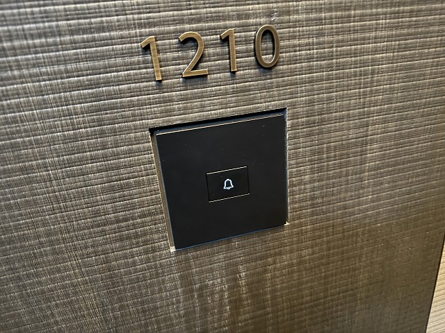 部屋番号は1210と分かりやすく出ています。カードキーを扉に当てて中に入っていきます。今どきの主流であるスマートフォンとの連携はまだありません。