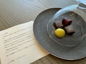 二日目には別のスイーツがシンプルながらセットされています。こちらのチョコレートも美味しく頂きました。