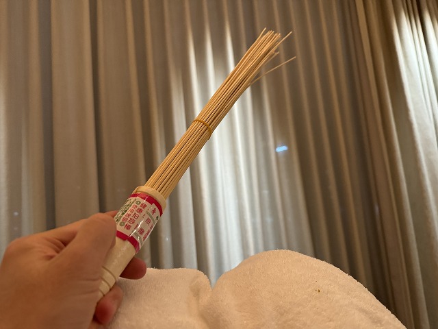 体温が上がって体の筋肉が完全に緩んだところで全身をマッサージです。竹の棒と合わせて丹念に全身を均一にして頂きました。
