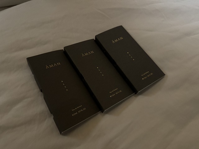 丸机も置いてあり便利に使えますが、今回は子供のためのエクストラベッドも入れて頂きました。追加されても部屋の広さは十分です。ターンダウンされると日替わりでアメニティが置かれます。最初はまさかのAMANのフェイシャルマスクです。こんなのあるんですね!二日目はアマンの香水でした。