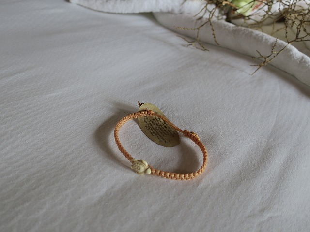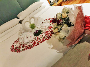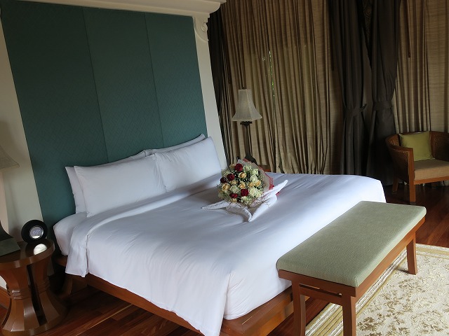 ベッドルームに入ると大きな寝心地抜群のベッドが真ん中に備えられています。私がリクエストしたとおりに花などが準備されています。お土産として亀の腕輪が置かれていました。