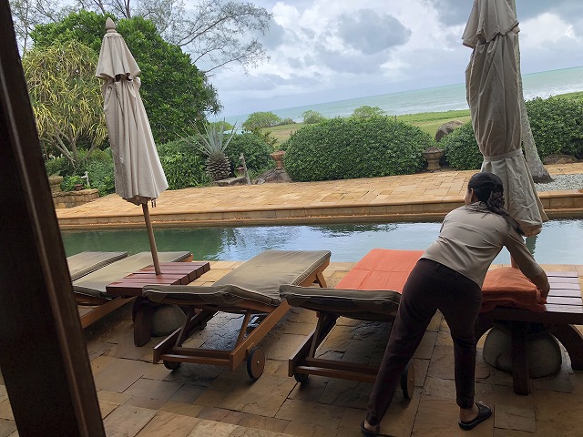 チェックイン時にアクティビティの確認をしたところ・・・間違いなく明日は大嵐なのでボートでの旅は辞めたほうが良いとの事でした。あれだけ大騒ぎして多くの方にお手伝い頂きましたが、最終的には全てなくなりました。私が結論を出したところで、このために集まってくれていたバトラー、レセプション、コンシェルジュの全員で大笑いです。申し訳ないのですが天気には勝てませんでした。友人夫妻も快く私の判断を受け入れてくれました。代わりに部屋でのプライベートBBQをバトラーの方から推奨されたのでお願いしておきます。