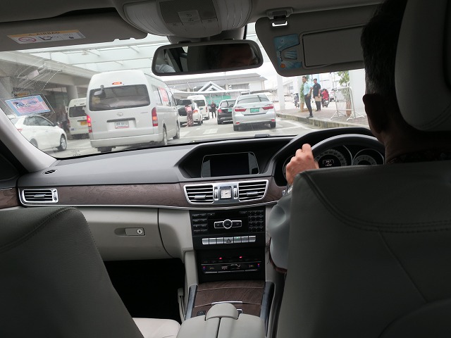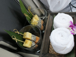 プーケットの空港に到着した私達を二台のベンツで迎えに来ていただきました。制限エリアを出た場所で直ぐにJWマリオットのスタッフがネームボードを掲げて待ってくれています。事前に送迎の部分はかなりお願いしておいたので、問題なく2台の車に分乗してホテルに移動します。車には冷たいタオルにフルーツが準備されています。飛行機に乗って少し胸焼けしていましたがフルーツでスッキリです。また微妙にタイミングを変えて私の車を先につくようにしておいて頂きます。友人夫妻の乗った車は私より数分遅れて到着してもいらいました。