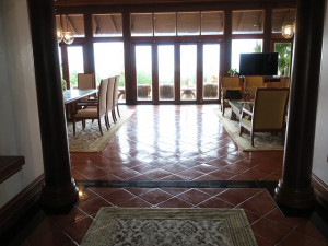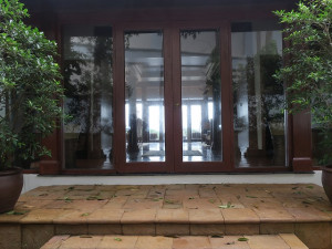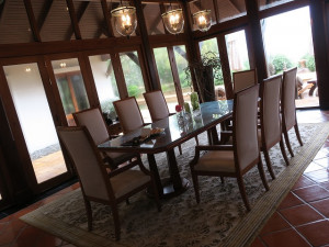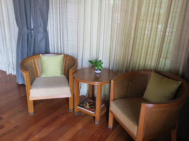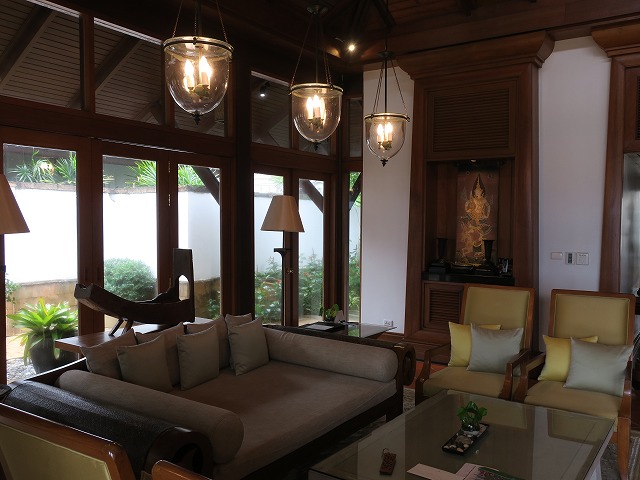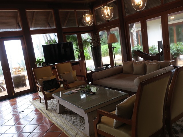鍵も頂いていますが、普段は部屋付きのバトラーの方が開け閉めして頂けるので何もすることはありません。バトラーの案内で中に入ります。最初の印象は古いが手入れがちゃんとされていると感じました。この最初の印象はホテルにとってとても大切です。良くも悪くも概ね此処で滞在の結果が決まってしまいます。真っすぐに進むとダイニング兼リビングルームになります。この部屋の壁もほとんど開ける事ができるようになっており、天気さえよければ全面開放して風を楽しめたのですが・・・今回は残念でした。