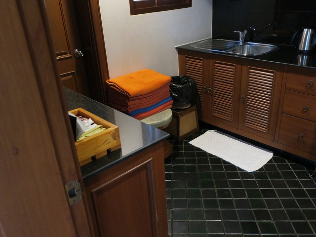 入口から左に進むとキッチンです。こちらに部屋付きのバトラーの方は待機しております。声をかけると直ぐに対応してくれます。キッチンからも外に出れるので食事を頼むと勝手に準備が進んでいきます。