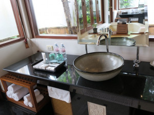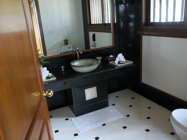 右と左で対照的に作られており、それぞれシンクがあります。バスタオルやハンドタオルの数も10以上あります。更にバトラーに頼めば幾らでも持ってきてくれるので全く不自由しません。準備されている物としては歯ブラシ・髭剃り・ソーイングキット・シャワーキャップ・櫛・綿棒・マウスウオッシュ・ボディーローションとあり無い物が無いぐらいです。そしてよく見ると外に出る扉もあります。そうです・・これで外に出て外のシャワーを楽しむこともできるように作られています。もう至れり尽くせりの構成ですね。