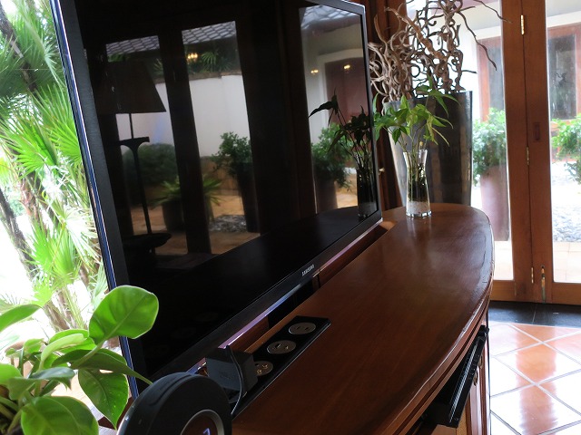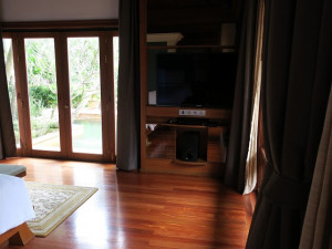 ベッドの向かいにはテレビが壁に備えられています。専用のウーファーが入っていたりと高機能なのですが・・・全く使いませんでした。そして二つあるビラの一つは窓を開けるとそのままプールと接続されています。