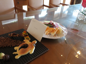 部屋の左側にはダイニングテーブルですが8人が座れる大きなテーブルが準備されています。その上に少しばかりのウエルカムフルーツとチョコレートが準備されています。普通であれば十分なサイズですが、これだけ部屋が広いとこじんまりと見えてしまうのは仕方ありませんね・・・しかしチョコレートは女性には受けたようです。テーブルのランプも渋い作りで夜になると更に雰囲気が上がります。