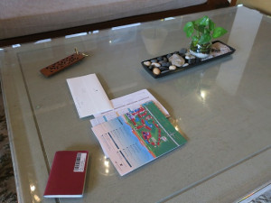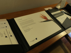 ソファーの真ん中にはローテブルが準備されています。ソファーに座りながら予定やホテルの設備について説明を受けます。リゾートマップを頂きますが広大なエリアです。レストランも相当数はいっていました。しかし我々はプライベートダイニングでほとんどを過ごしたのであまりホテルの設備には行きませんでした。