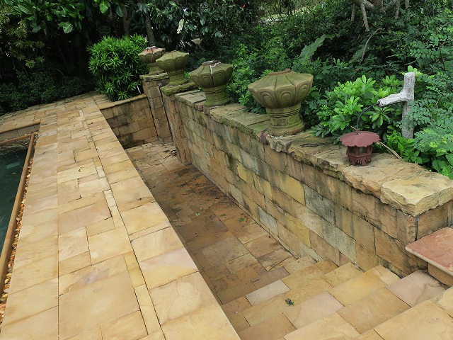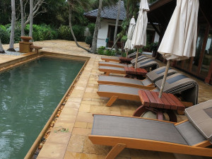 メインパビリオンから外に出ると庭というかプールです。ちゃんと泳ぐことができるプールに、サンラウンジャーが6台と全てそろっています。プールの裏に回るとそのままビーチに直結しています。昔はもう少しプールが大きかったような情報もありました。