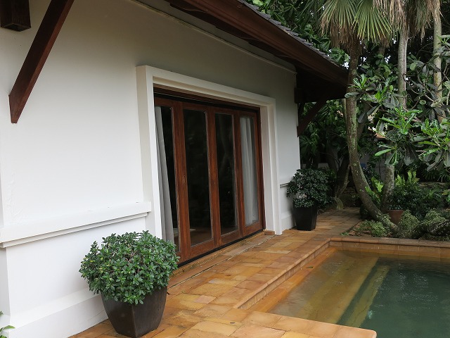 左右に同じ構成で個人のビラがあります。ビラの中にはベッドルームとウエットエリアがあります。これだけで普通のビラと同じ機能ですね。左右の違いは唯一 外のプールに直結しているか否かの違いでした。