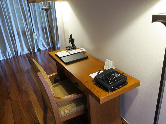 右側に入るとベッドルームですが先ずは書斎になります。部屋の真ん中に壁を造り上手く分離していますね。書斎の上にはホテル案内と電話機です。最新型ではありませんが機能は十分です。しかし・・仕事をするには少し狭いですね。もともと机に座って仕事をすることは無いようなホテルですが・・・