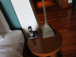 サイドテーブルには時計と電話以外は何もありません。このぐらいが良いですよね・・ベッドサイドは何も無いのが私の好みです。USBアウトレットを除いて。