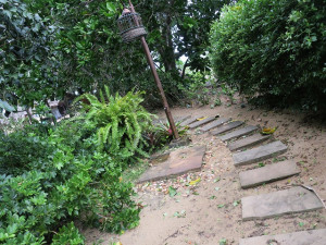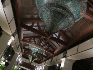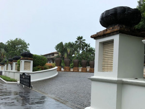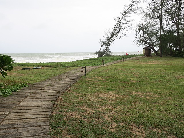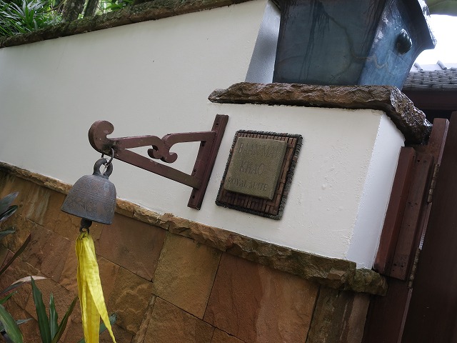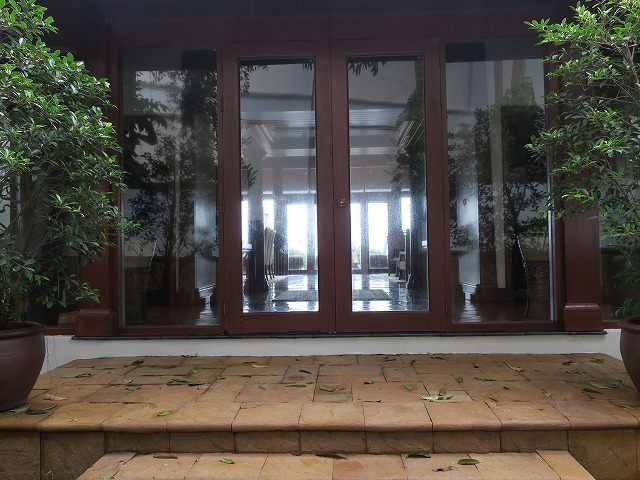 ロイヤル・ビラの入口には大きな鐘がついておりスタッフが来ると鳴らしてくれます。しかし全く聞こえませんがね・・(笑) 入口の扉を開けて中に入ると大きく開放可能な扉があります。周囲には植木も多くあり緑豊かな感じですが・・・如何せん嵐が通過しており風が吹き荒れ、草木が舞っています。海岸の波の轟轟とした音がこの場所でも聞こえました。