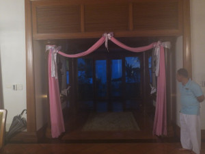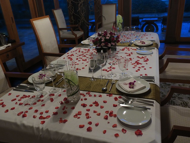 夜には頼んでおいたBBQです。先ずは机の上が総てバラの花で飾られています!こんなの見たことありません。私も自分の時にして欲しいくらいです。入口にも飾りが付けられて向かい得れる準備万端です。スタッフもバトラー入れて6名ほど待機しています。我々の倍の人数ですね!