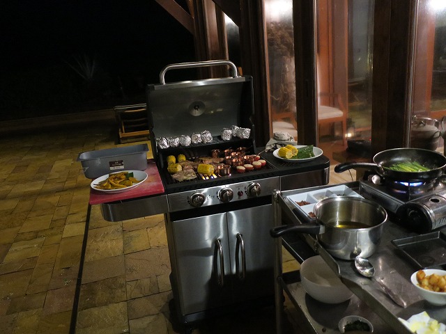肝心の調理ですが、さすがに部屋の中でバーベキューはできないようで部屋の外に専用のコンロなどを持ち込んで作られていました。シェフもこのためだけに準備してくれています。調理中に見に行くと奇麗に総て並んで手際よく作られていました。流石ですね!