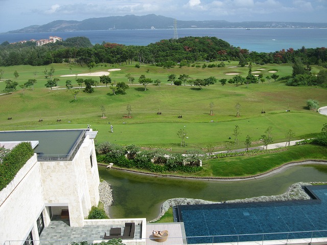 外を見るとマリオットホテルとブセナテラスのホテルが見えます。また特徴としてある隣接しているゴルフ場が良く見えます。ホテルの施設としては室外プールなども見えます。