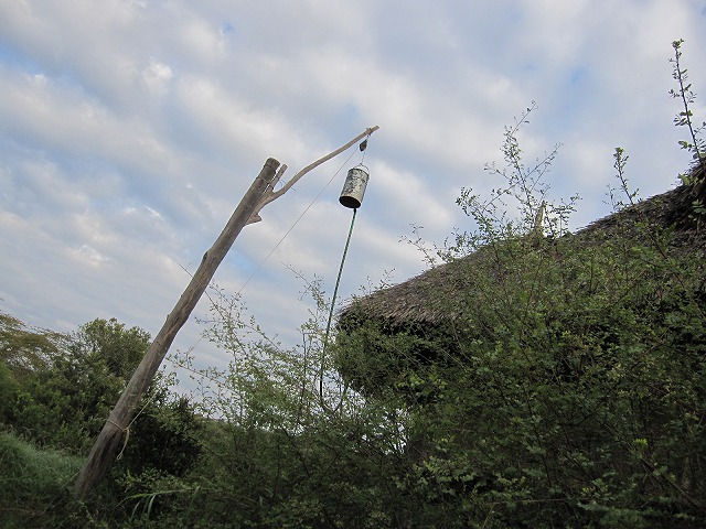 さてサッパリしたいときのシャワーですがこれが面白い。電気なんてありませんから、火で水を温めて大きな缶に入れて上にあげます。この状態で下のシャワーの口を触ると暖かい水が出ると言う仕掛けです。